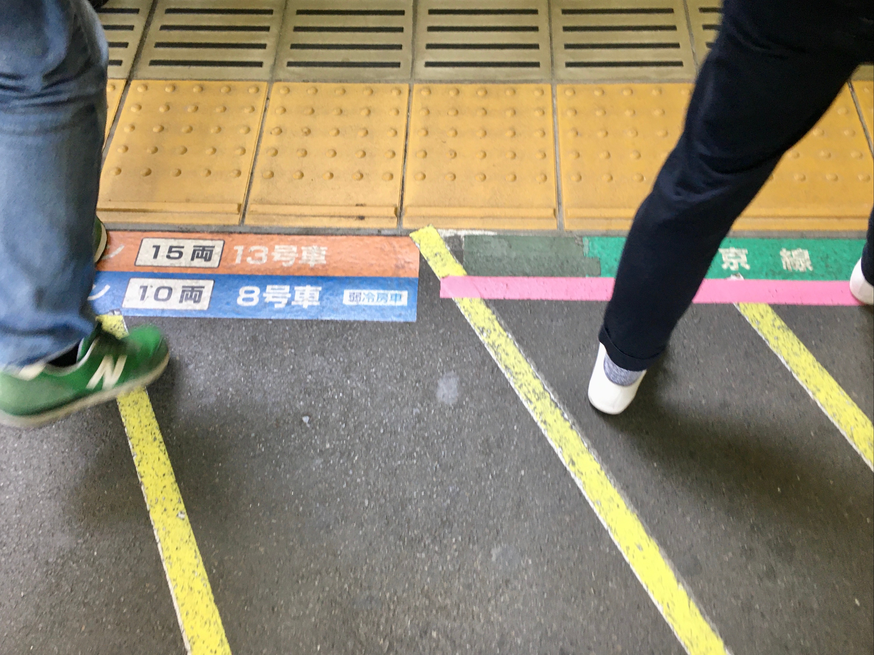 Train boarding etiquette is clear and patient queuing is expected. Painted lines on the floors show where the train doors will open so people line up at the right spot. Notice the different colors for each queue. Trains arrive one after another, and the doors for each train line up at a certain point.