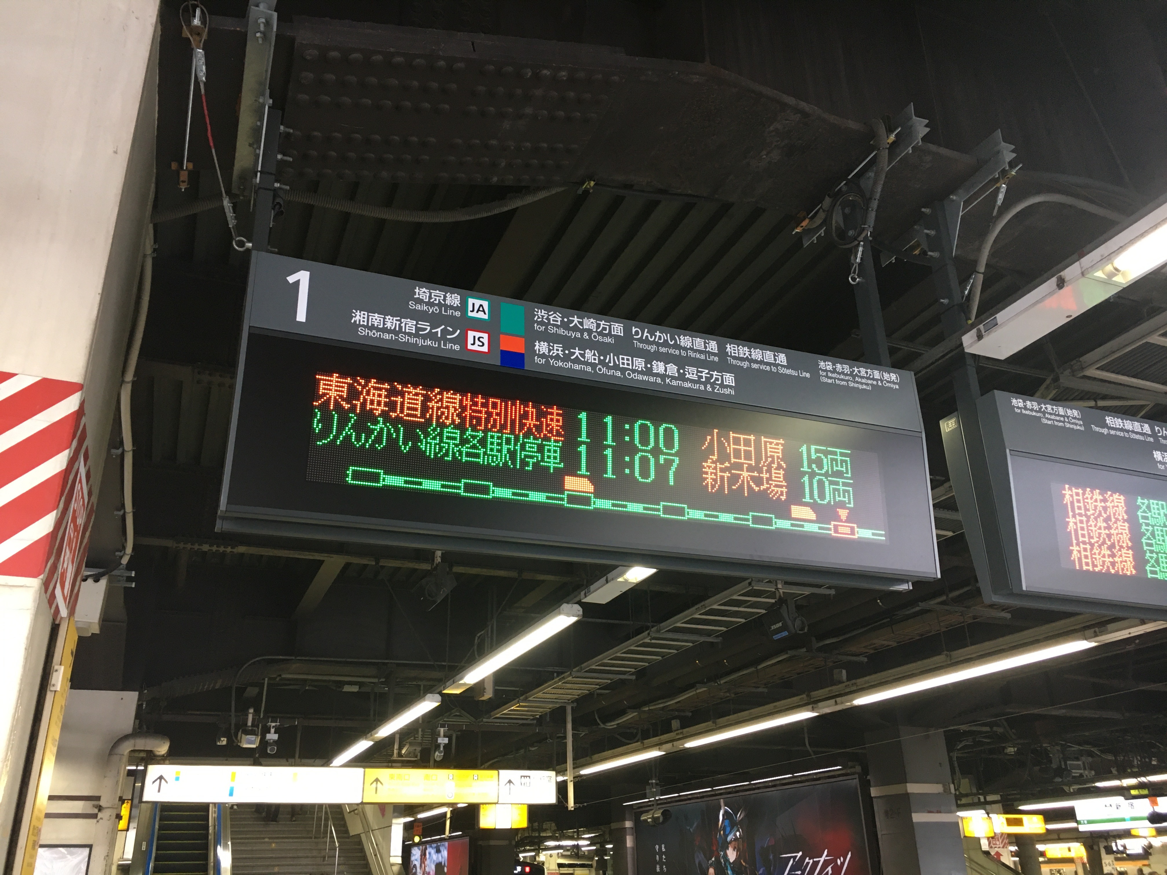 Check the monitor above the platform to see which queue you should be in. Signs also scroll to English translations. Color-coded notices correspond to the colors on the platform. For example, JA denotes the Saikyo Line, and JS the Shonan-Shinjuku Line.